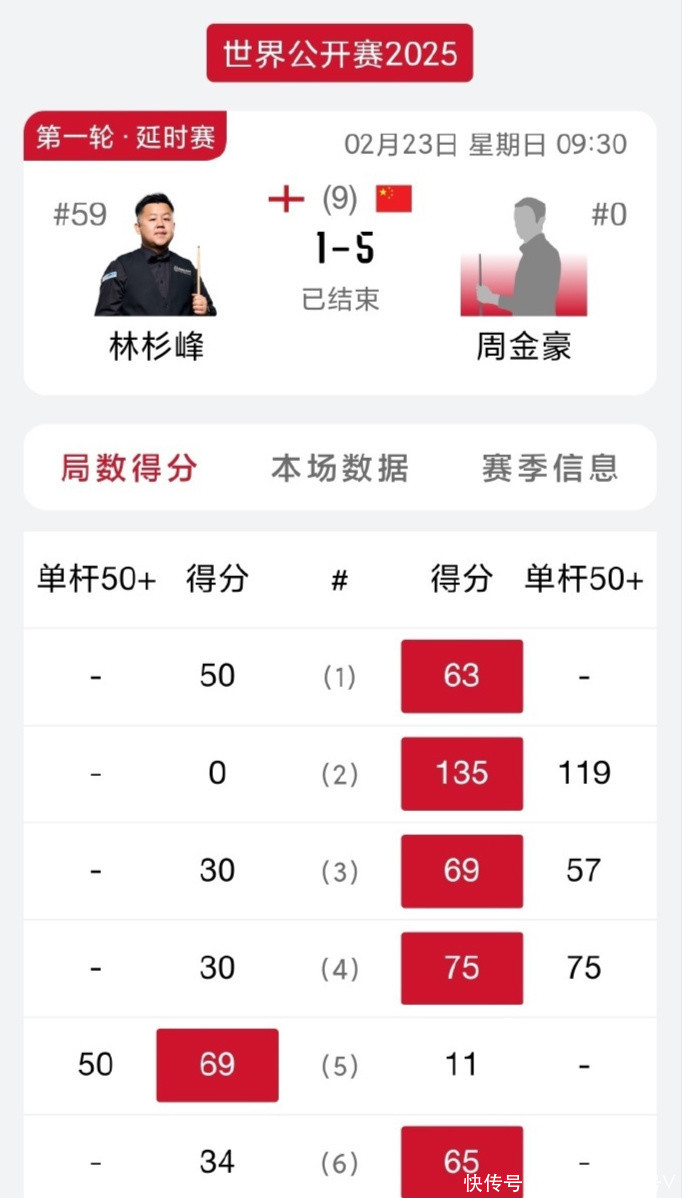 威尔士公开赛结束后,2025年斯诺克世界公开赛接棒举行。中国选手刘宏宇在第一轮以5-2爆冷战胜塞尔比。另一场比赛,外持卡赛场的周金豪迎战林杉峰。本赛季初期,周金豪曾经持外卡打在上海大师赛战胜过国锦赛冠军张安达,展示出了不错的实力。